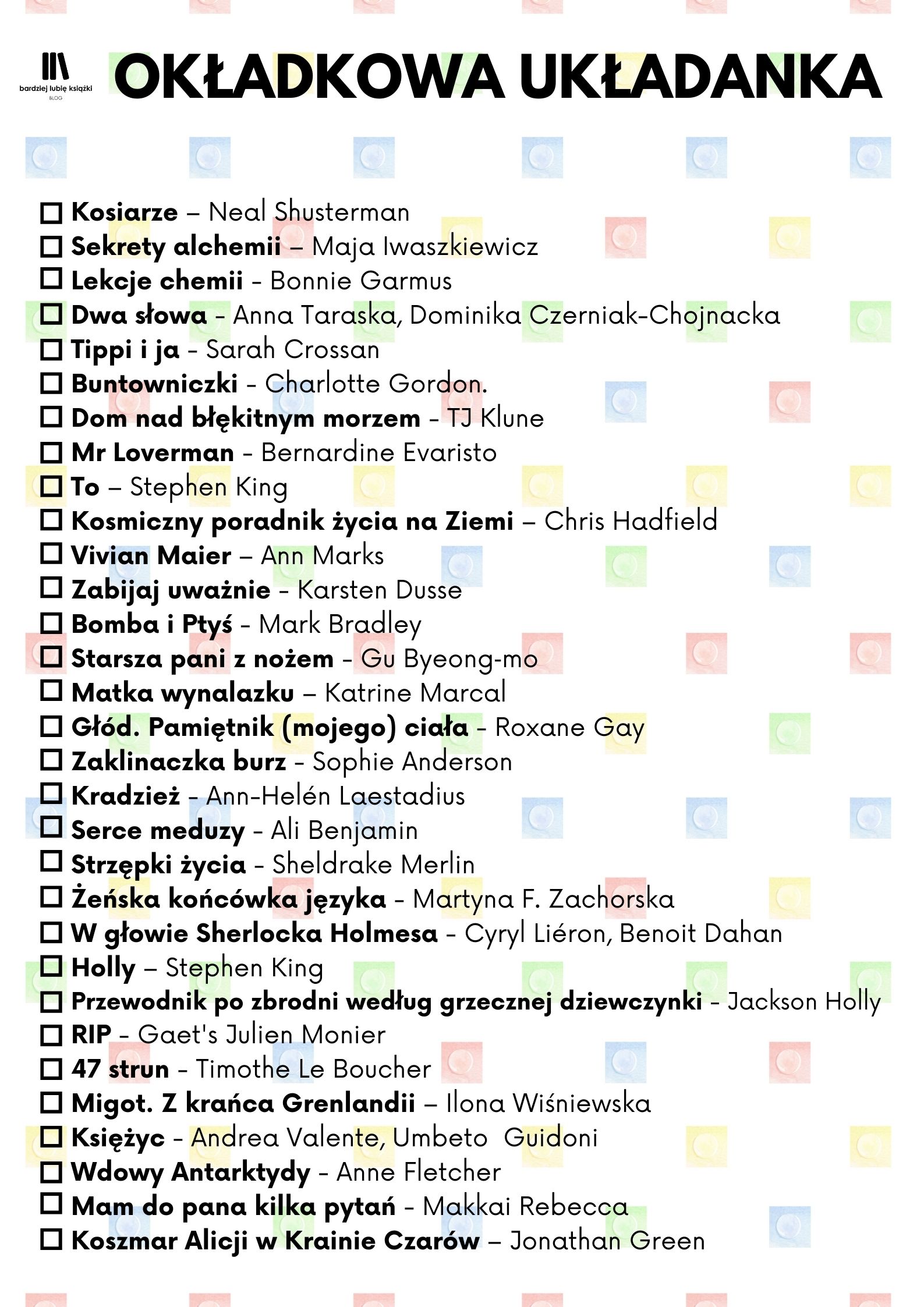 Przed Wami plik do pobrania z grudniowej zabawy 2024 🙂 Plansze do zgadnięcia są na IG w wyróżnionych relacjach, a tu lista, gdybyście chcieli przeczytać te książki. Warto!