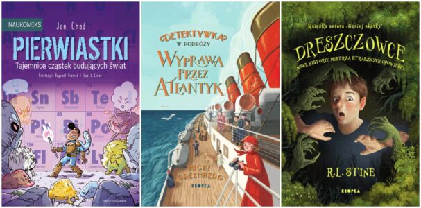Są też trzy książki dla dzieci. Mamy nowy naukomiks, tym razem o pierwiastkach. Ja jestem fanką tej serii, w bardzo fajny, zabawny i przystępny sposób można się dowiedzieć różnych ciekawych, rzeczy dorosłym też polecam! I mamy też dwa super tytuły z wydawnictwa Kropka. Detektywka w podróży. Wyprawa przez Atlantyk to powieść przygodowo-detektywistyczna dla dzieciaków 9+. Nasza bohaterka wyrusza w tytułową podróż z tatą kapitanem – ale nic nie pokazuje się takie, jak myślała! Czytaliście kiedyś Gęsią Skórkę? No to teraz mamy 10 nowych opowiadań od tego samego autora. Dreszczowce. Nowe historie mistrza strasznych opowieści. To historie nie dość straszne, aby się bać, ale pozwalające poczuć się nieswojo. R.L. Stine, autor słynnej „Gęsiej skórki”, często nazywany Stephenem Kingiem literatury dziecięcej, z wielką wprawą buduje klimat grozy, sięgając po wszystkie sprawdzone w horrorze chwyty: koszmary senne, urojenia, fobie. Dotyka też dziecięcych lęków takich jak: wygórowane oczekiwania rodziców, szkolny bullying, niełatwe relacje z przyjaciółmi, rywalizacja rówieśnicza, lęk przed ciemnością, ciasnymi pomieszczeniami, insektami.
