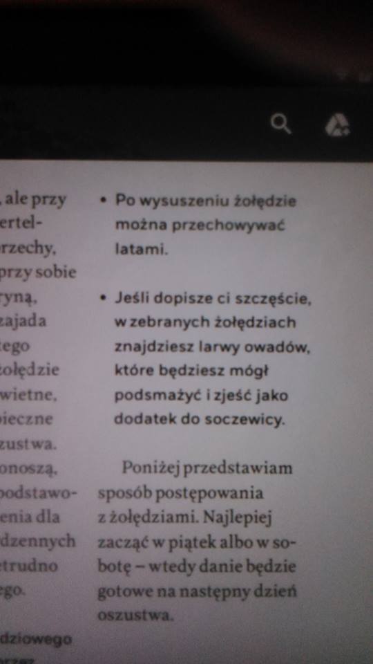 Po pierwsze książka powinna być w domu w wersji papierowej. To książka, którą powinno się mieć na półce i sięgać do niej od czasu do czasu, według potrzeb. Nie jest to książka, którą się czyta na raz. Może do niej wracać wielokrotnie i chyba takie jest jej przeznaczenie. Myślę też, że wiele osób może znaleźć tam pożyteczne informacje. To prowadzi do mojej głównej konkluzji – to jest idealny podręcznik przetrwania! Na wypadek apokalipsy albo ataku zombie. Znajdziecie tam wszystko – od informacji, jak rozpalić ognisko, przez naukę skórowania zwierząt (własnoręcznie upolowanych zresztą), rodzaje broni i noży aż po naukę, jak zrobić kolację dla dziewięciu osób. Pod tym względem książka jest świetna i bardzo przydatna. Chociaż i tutaj nie umiałam się pozbyć wrażenia, że jest napisana tylko dla Amerykanów. Nie żebym komuś ubliżała, ale pewne “rady” (np. obrazek noża, na którym było rozpisane gdzie jest ostrze, a gdzie rękojęść) były poniżej pasa. A to, że taka właśnie książka stała się w Ameryce bestsellerem, wiele o nich mówi…